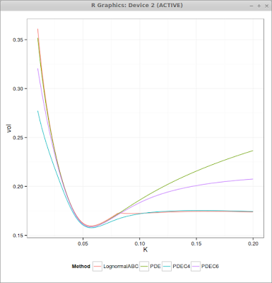The following graphs presents the non capped PDE, the capped PDE with M=4*nu (PDEC4) and M=6*nu (PDEC6) as well as the approximation (Andersen Ratcliffe / Gatheral first order) where I have only taken care of the right wing. The SABR parameters are alpha = 0.0630, beta = 0.7, rho = -0.363, nu = 0.421, T = 10, f = 0.0439.