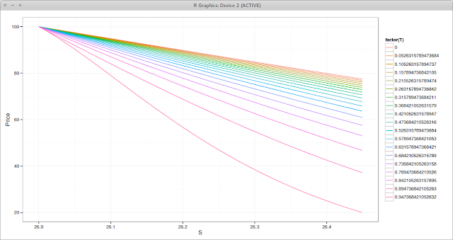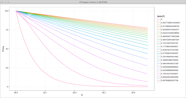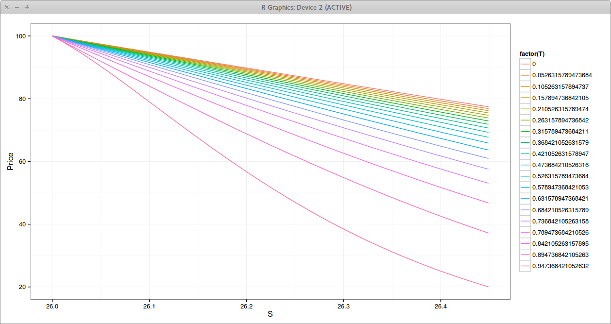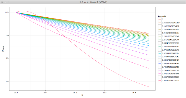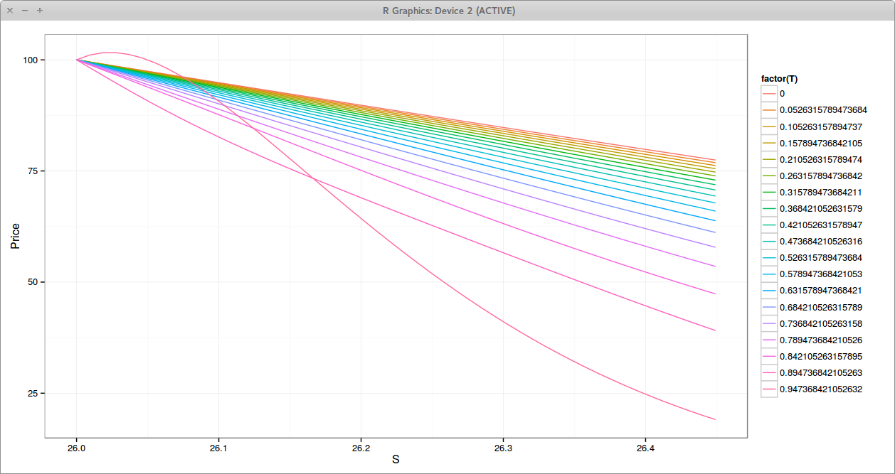 Crank-Nicolson Prices near the Barrier. Each line is a different time.