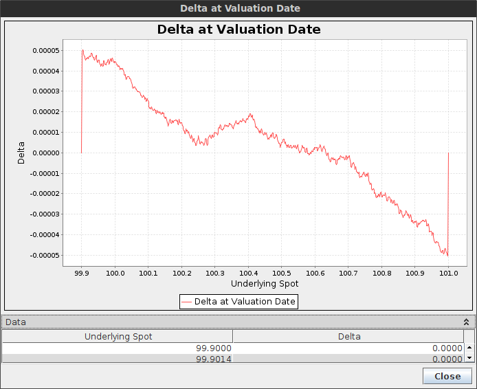 Delta with the TR-BDF2 finite difference method - the scale goes from -0.00008 to 0.00008.