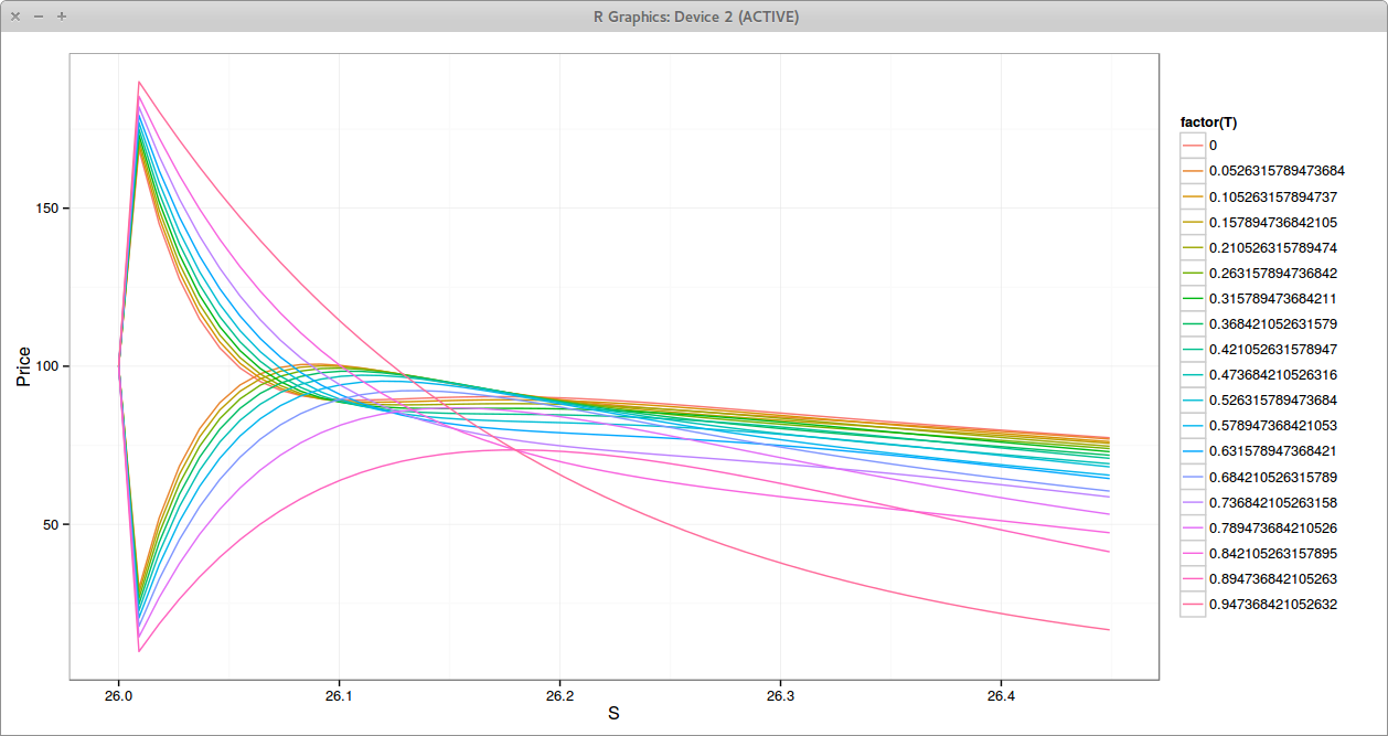 TR-BDF2 Prices near the Barrier. Each line is a different time.