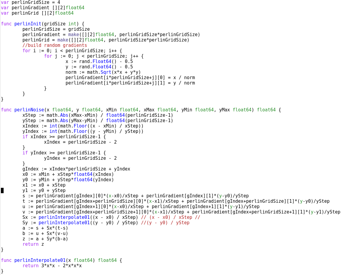 The insight of Perlin noise is to not generate random color values that would be assigned to shades of grey as in my examples, but to generate random gradients, and interpolate on those gradient in a smooth manner. In computer graphics they like the cosine function to give a little bit of non-linearity in the colors. A good approximation, usually used as a replacement in this context is 3x^2 - 2x^3. It's not much more complicated than that, this web page explains it in great details. It can be programmed in a few lines of code.