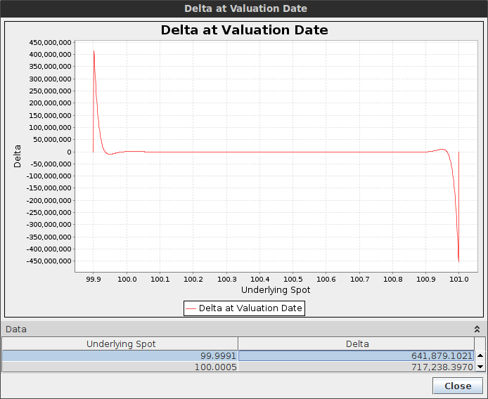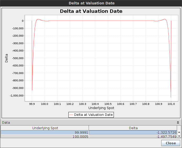 It is particularly evident when the option is sure to be hit, for example when the barriers are narrow, that is our delta should be around zero as well as our gamma. Let's consider a double one touch option with spot=100, upBarrier=101, downBarrier=99.9, vol=20%, T=1 month and a payout of 50K.