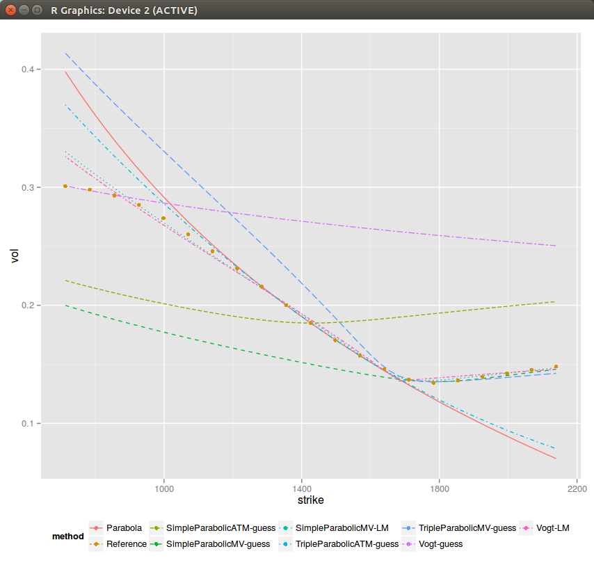 We clearly see that ATM the fit is better for the parabolic initial guess than for Vogt, but as one goes further away from ATM, Vogt guess seems better.