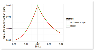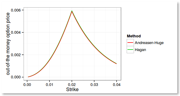 While looking at the implied volatilities I found something intriguing with Andreasen Huge: the implied volatilities from the refined solution using the corrected forward volatility look further away from the Hagan implied volatilitilies than without adjustment, and it's quite pronounced at the money.