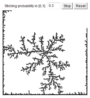 Yes, I wrote an applet. I know it is very 1990s but, amazingly, it still does the job quite well. Ok, next time I should really use Flash to do this.The Applet simulates Diffusion Limited Aggregation as described in Chaos And Fractals from Peitgen, Juergens, and Saupe. It represents ions randomly wandering around (in a Brownian motion) until they are caught by an attractive force in electrochemical deposition experiment. This kind of phenomenon occurs at all scales, for example it happens in the distribution of galaxies. You can play around with the applet at http://31416.appspot.com/dla.vm